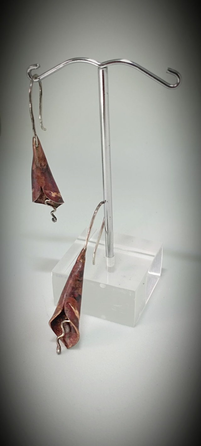 Entre la fleur et la clochette, cette jolie paire de boucles d'oreilles à été forgé dans le Cuivre. La tige est elle en Argent 925.