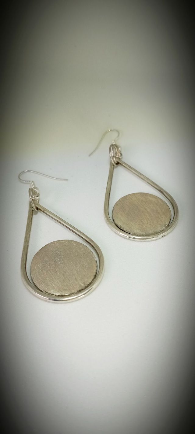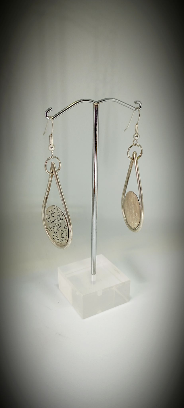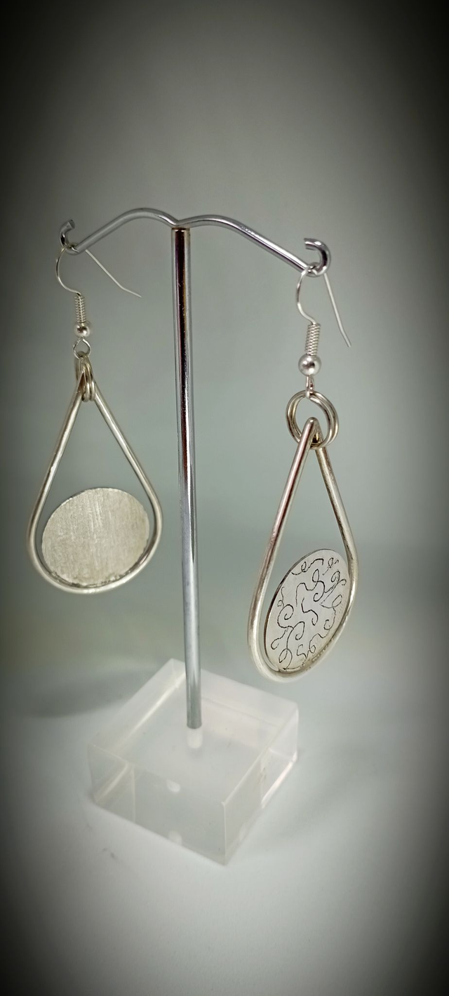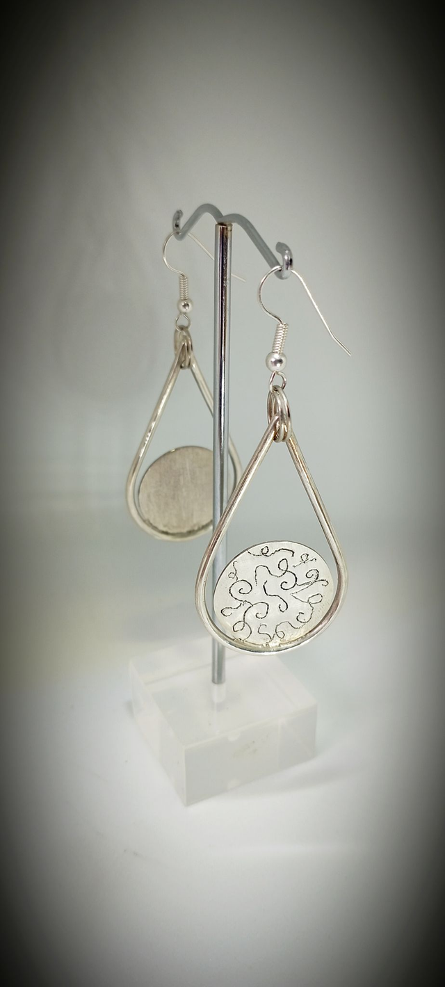 En forme de goutte avec un disque d'argent gravé et soudé en son intérieur.